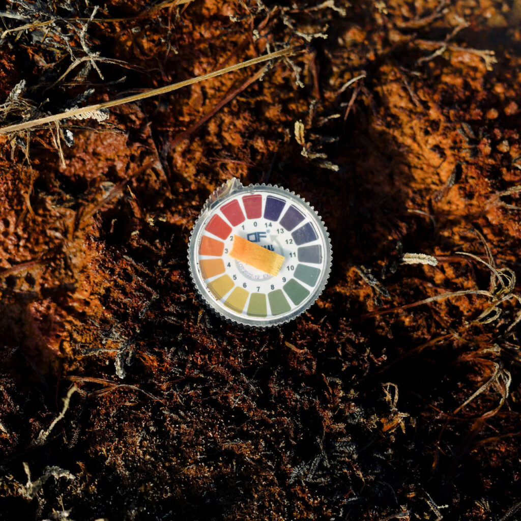 כיתוב תמונה: מדען בודק את רמת החומציות של המים הכתומים. רמת החומציות שנמדדה הייתה 2–3. מרבית היצורים החיים בנהרות, באגמים ובביצות אינם יכולים לשרוד אם המים חומציים מדי, לרוב מתחת לרמה 5.